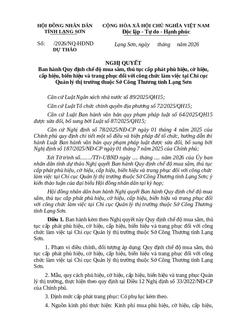 Dự thảo Nghị quyết ban hành Quy định chế độ mua sắm, thủ tục cấp phát phù hiệu, cờ hiệu, cấp hiệu, biển hiệu và trang phục đối với công chức làm việc tại Chi cục Quản lý thị trường thuộc Sở Công Thương tỉnh Lạng Sơn