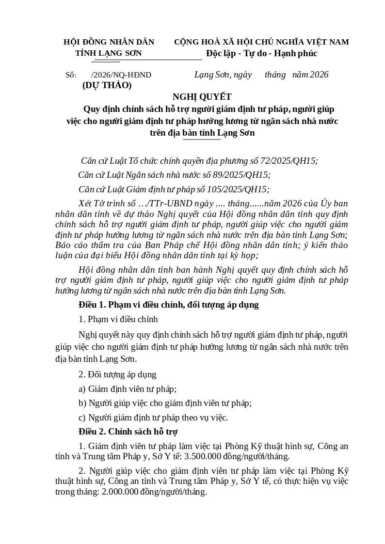 Xét Tờ trình số …/TTr-UBND ngày .... tháng......năm 2026 của Ủy ban nhân dân tỉnh về dự thảo Nghị quyết của Hội đồng nhân dân tỉnh quy định chính sách hỗ trợ người giám định tư pháp, người giúp việc cho người giám định tư pháp hưởng lương từ ngân sách nhà nước trên địa bàn tỉnh Lạng Sơn; Báo cáo thẩm tra của Ban Pháp chế Hội đồng nhân dân tỉnh; ý kiến thảo luận của đại biểu Hội đồng nhân dân tỉnh tại kỳ họp;