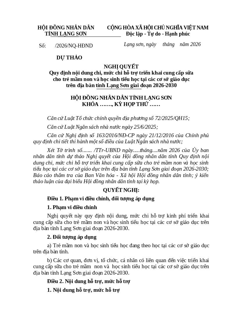 Nghị quyết này quy định nội dung, mức chi hỗ trợ kinh phí triển khai cung cấp sữa cho trẻ mầm non và học sinh tiểu học tại các cơ sở giáo dục trên địa bàn tỉnh Lạng Sơn giai đoạn 2026-2030.