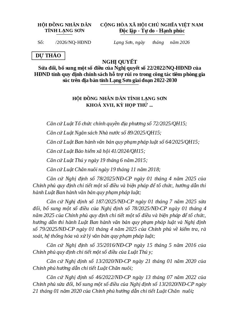 Dự thảo Nghị quyết sửa đổi, bổ sung một số điều của Nghị quyết số 22/2022/NQ-HĐND của HĐND tỉnh quy định chính sách hỗ trợ rủi ro trong công tác tiêm phòng gia súc trên địa bàn tỉnh Lạng Sơn giai đoạn 2022-2030