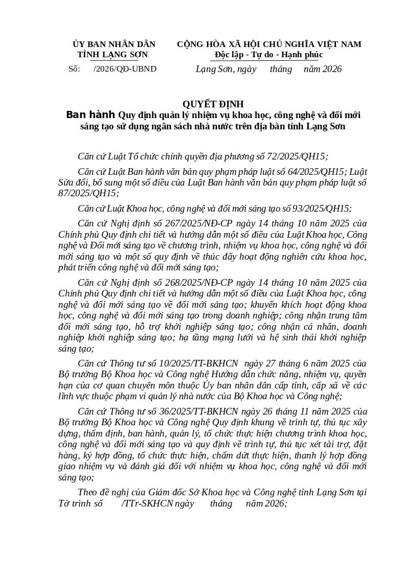 Theo đề nghị của Giám đốc Sở Khoa học và Công nghệ tỉnh Lạng Sơn tại Tờ trình số        /TTr-SKHCN ngày       tháng      năm 2026;
