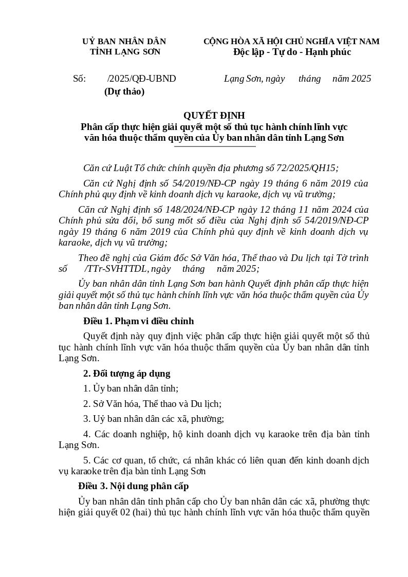 Phân cấp thực hiện giải quyết một số thủ tục hành chính lĩnh vực văn hóa thuộc thẩm quyền của Ủy ban nhân dân tỉnh Lạng Sơn