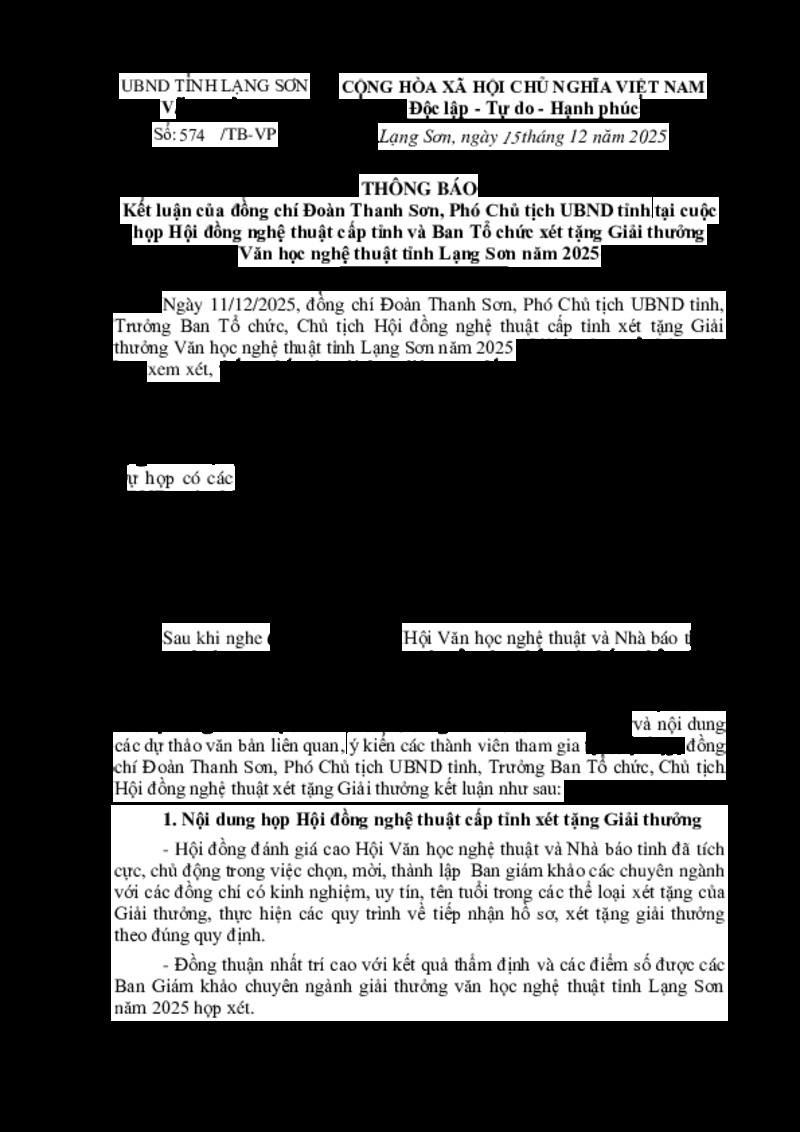 | Tiêu đề văn bản | Kết luận của đồng chí Đoàn Thanh Sơn, Phó Chủ tịch UBND tỉnh tại cuộc họp Hội đồng nghệ thuật cấp tỉnh và Ban Tổ chức xét tặng Giải thưởng Văn học nghệ thuật tỉnh Lạng Sơn năm 2025 | ||