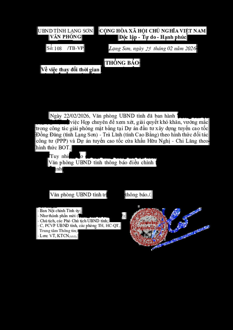 | Tiêu đề văn bản | Thông báo về việc thay đổi thời gian Họp chuyên đề xem xét, giải quyết khó khăn, vướng mắc trong công tác giải phóng mặt bằng tại Dự án đầu tư xây dựng tuyến cao tốc Đồng Đăng (tỉnh Lạng Sơn) - Trà Lĩnh (tỉnh Cao Bằng) theo hình thức đối tác công tư (PPP) và Dự án tuyến cao tốc cửa khẩu Hữu Nghị - Chi Lăng theo hình thức BOT | ||