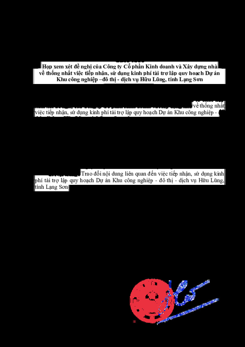 | Tiêu đề văn bản | Giấy mời họp xem xét đề nghị của Công ty Cổ phần Kinh doanh và Xây dựng nhà về thống nhất việc tiếp nhận, sử dụng kinh phí tài trợ lập quy hoạch Dự án Khu công nghiệp -đô thị - dịch vụ Hữu Lũng, tỉnh Lạng Sơn | ||