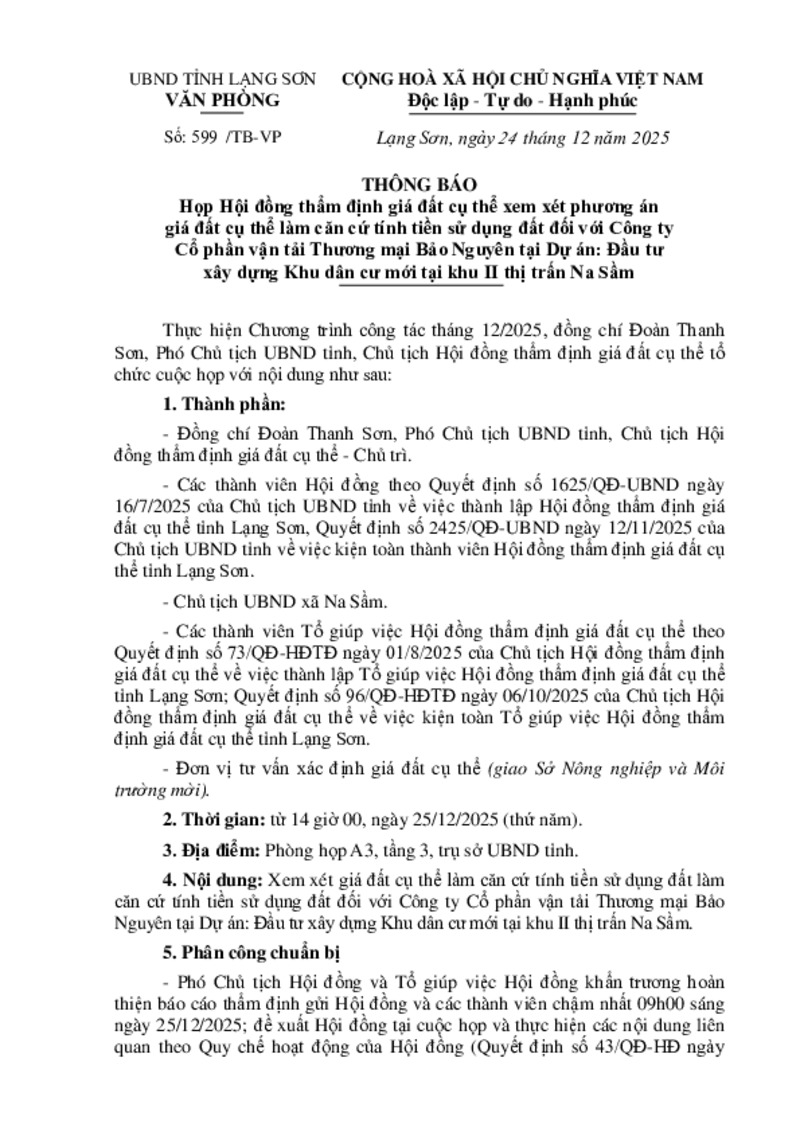 | Tiêu đề văn bản | Thông báo Họp Hội đồng thẩm định giá đất cụ thể xem xét phương án giá đất cụ thể làm căn cứ tính tiền sử dụng đất đối với Công ty Cổ phần vận tải Thương mại Bảo Nguyên tại Dự án: Đầu tư xây dựng Khu dân cư mới tại khu II thị trấn Na Sầm | ||