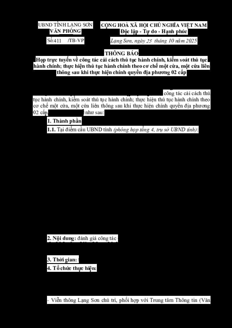 | Tiêu đề văn bản | Thông báo họp trực tuyến về công tác cải cách thủ tục hành chính, kiểm soát thủ tục hành chính; thực hiện thủ tục hành chính theo cơ chế một cửa, một cửa liên thông sau khi thực hiện chính quyền địa phương 02 cấp | ||