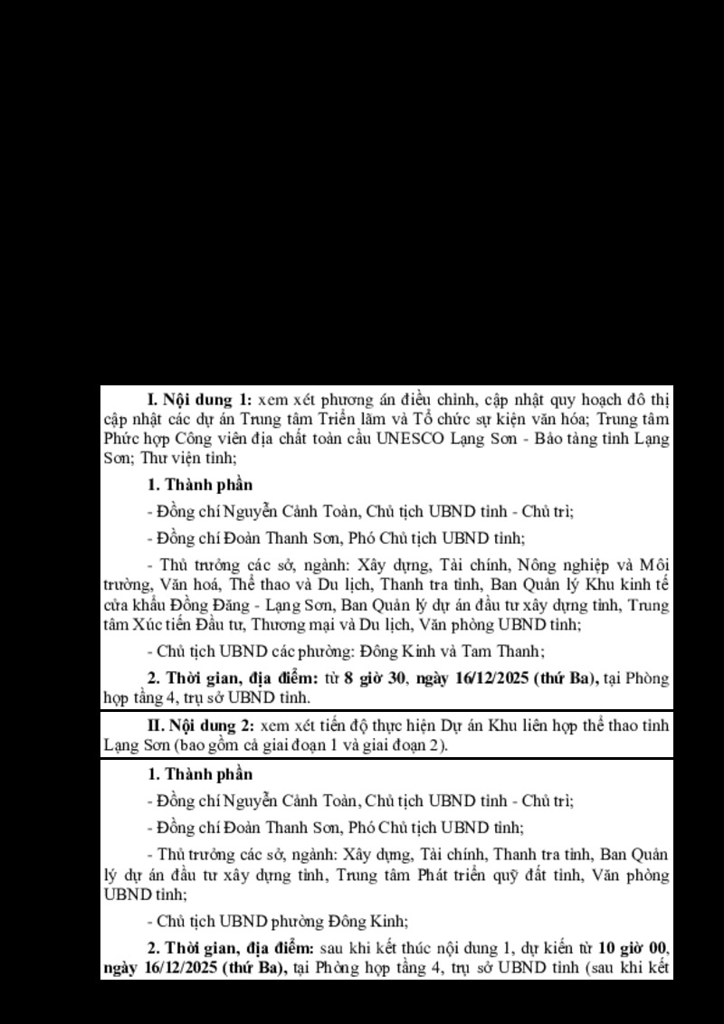 | Tiêu đề văn bản | Thông báo họp xem xét phương án quy hoạch liên quan đến các dự án đầu tư công thuộc lĩnh vực văn hóa, dự kiến khởi công mới thuộc Kế hoạch đầu tư công giai đoạn 2026-2030; tiến độ thực hiện Dự án Khu liên hợp thể thao tỉnh Lạng Sơn | ||