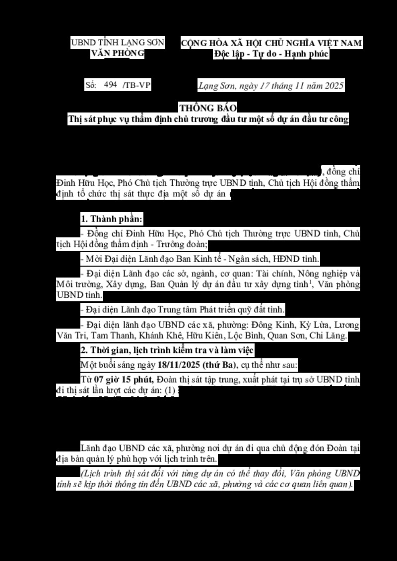 | Tiêu đề văn bản | Thông báo thị sát phục vụ thẩm định chủ trương đầu tư một số dự án đầu tư công | ||