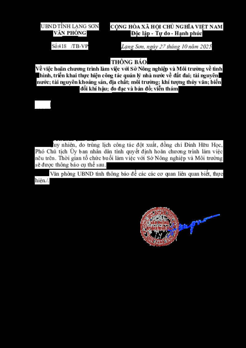 | Tiêu đề văn bản | Thông báo về việc hoãn chương trình làm việc với Sở Nông nghiệp và Môi trường về tình hình, triển khai thực hiện công tác quản lý nhà nước về đất đai; tài nguyên nước; tài nguyên khoáng sản, địa chất; môi trường; khí tượng thủy văn; biến đổi khí hậu; đo đạc và bản đồ; viễn thám | ||