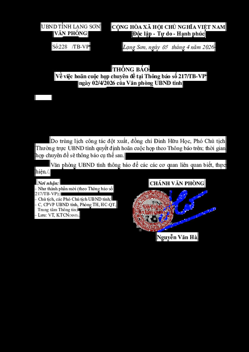 | Tiêu đề văn bản | Thông báo về việc hoãn cuộc họp chuyên đề tại Thông báo số 217/TB-VP ngày 02/4/2026 của Văn phòng UBND tỉnh | ||