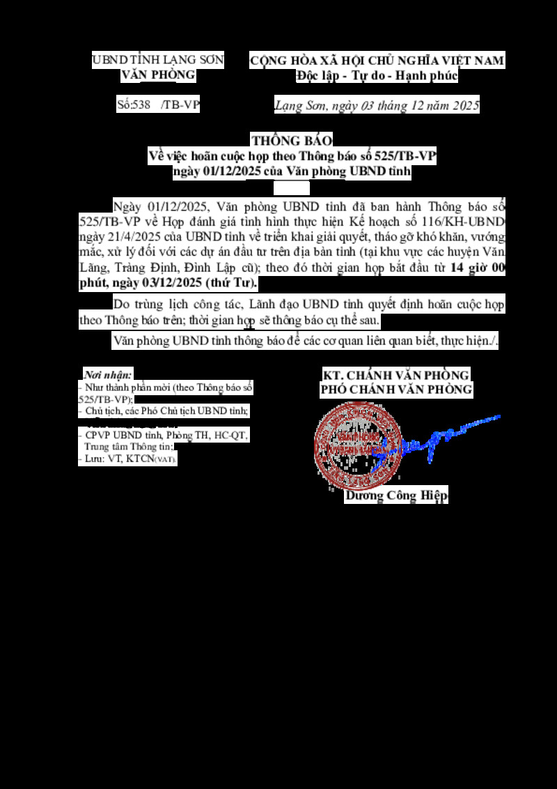 | Tiêu đề văn bản | Thông báo về việc hoãn cuộc họp theo Thông báo số 525/TB-VP ngày 01/12/2025 của Văn phòng UBND tỉnh | ||
