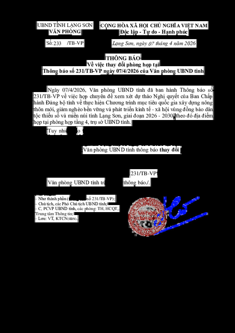 | Tiêu đề văn bản | Thông báo Về việc thay đổi phòng họp tại Thông báo số 231/TB-VP ngày 07/4/2026 của Văn phòng UBND tỉnh | ||