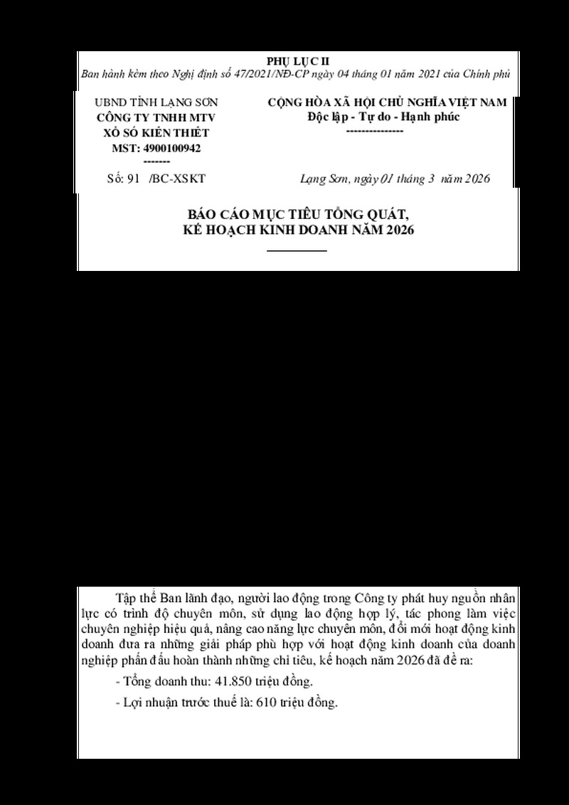 | Tiêu đề văn bản | Báo cáo mục tiêu tổng quát, kế hoạch kinh doanh năm 2026 | ||