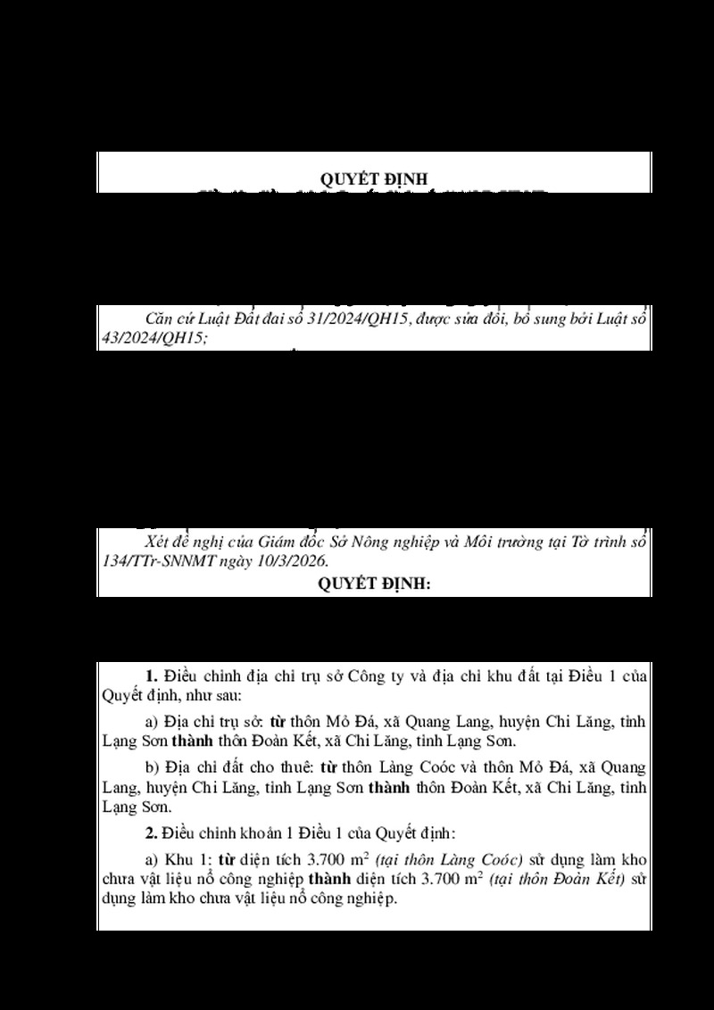 | Tiêu đề văn bản | Quyết định điều chỉnh nội dung tại Quyết định số 631/QĐ-UBND ngày 23/4/2015 của UBND tỉnh Lạng Sơn về việc cho Công ty cổ phần Đá Đồng Mỏ thuê đất | ||