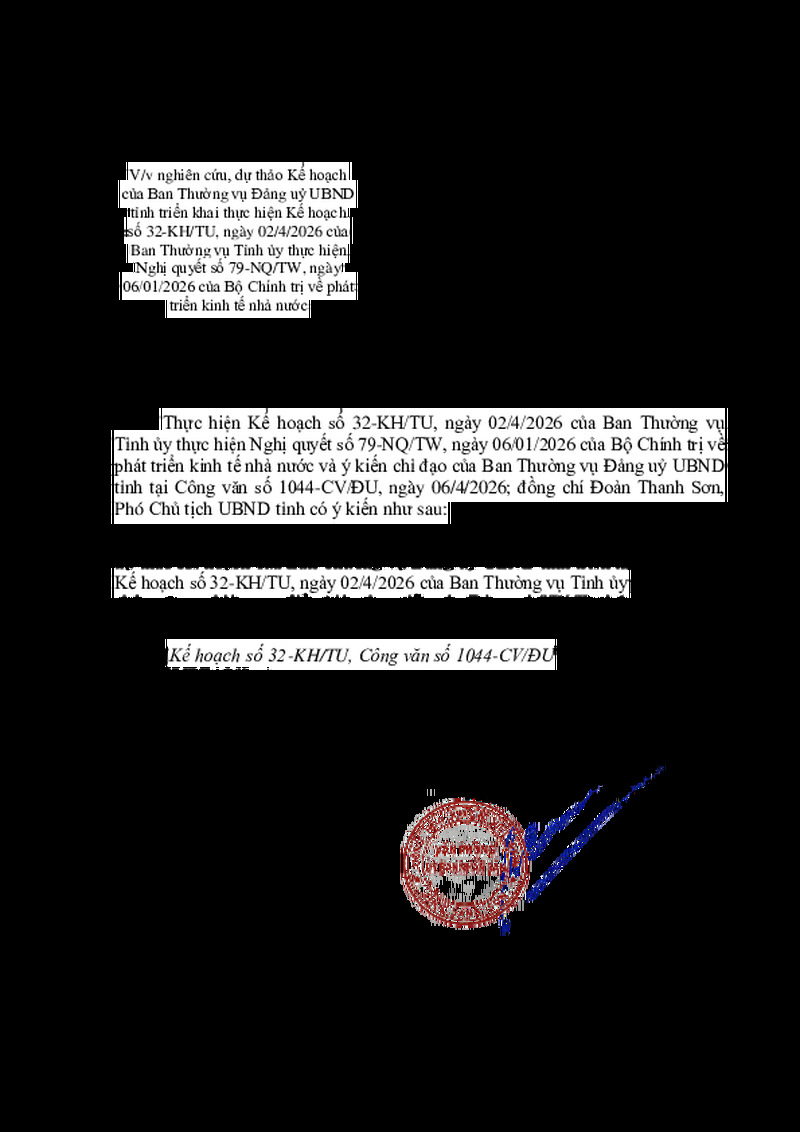 | Tiêu đề văn bản | V/v nghiên cứu, dự thảo Kế hoạch của Ban Thường vụ Đảng uỷ UBND tỉnh triển khai thực hiện Kế hoạch số 32-KH/TU, ngày 02/4/2026 của Ban Thường vụ Tỉnh ủy thực hiện Nghị quyết số 79-NQ/TW, ngày 06/01/2026 của Bộ Chính trị về phát triển kinh tế nhà nước | ||