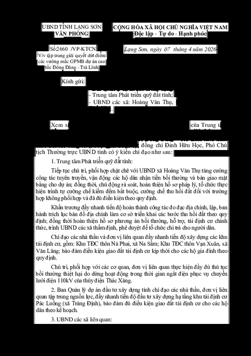 | Tiêu đề văn bản | V/v tập trung giải quyết dứt điểm các vướng mác GPMB dự án cao tốc Đông Đăng - Trà Lĩnh | ||
