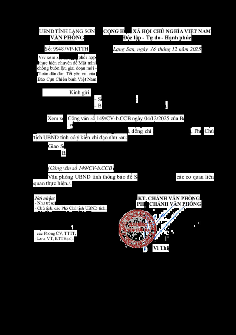 | Tiêu đề văn bản | V/v xem xét đề nghị phối hợp thực hiện chuyên đề Mặt trận chống buôn lậu giai đoạn mới - Toàn dân đón Tết yên vui của Báo Cựu Chiến binh Việt Nam | ||