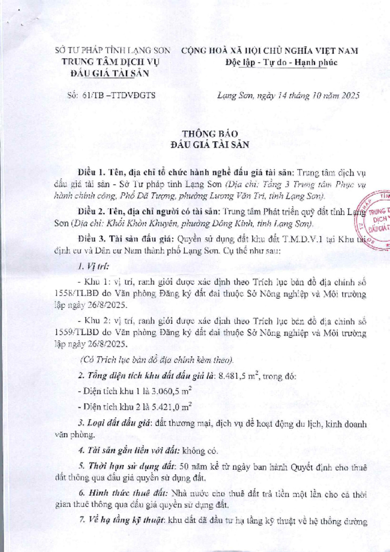 Tiêu đề văn bản | Thông báo bán đấu giá quyền sử dụng đất khu đất T.M.D.V.1 tại Khu tái định cư và Dân cư Nam thành phố Lạng Sơn | ||