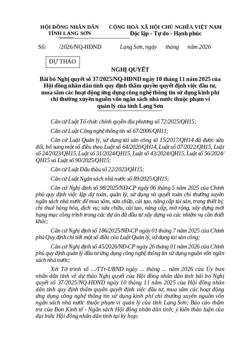 Xét Tờ trình số .../TTr-UBND ngày ... tháng ... năm 2026 của Ủy ban nhân dân tỉnh về dự thảo Nghị quyết của Hội đồng nhân dân tỉnh bãi bỏ Nghị quyết số 37/2025/NQ-HĐND ngày 10 tháng 11 năm 2025 của Hội đồng nhân dân tỉnh quy định thẩm quyền quyết định việc đầu tư, mua sắm các hoạt động ứng dụng công nghệ thông tin sử dụng kinh phí chi thường xuyên nguồn vốn ngân sách nhà nước thuộc phạm vi quản lý của tỉnh Lạng Sơn; Báo cáo thẩm tra của Ban Kinh tế - Ngân sách Hội đồng nhân dân tỉnh; ý kiến thảo luận của đại biểu Hội đồng nhân dân tỉnh tại kỳ họp;