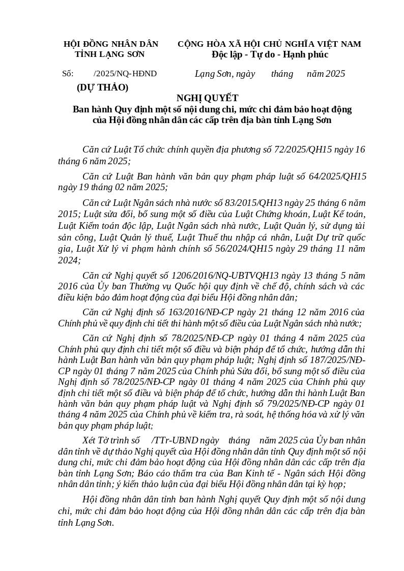 Xét Tờ trình số /TTr-UBND ngày tháng năm 2025 của Ủy ban nhân dân tỉnh về dự thảo Nghị quyết của Hội đồng nhân dân tỉnh Quy định một số nội dung chi, mức chi đảm bảo hoạt động của Hội đồng nhân dân các cấp trên địa bàn tỉnh Lạng Sơn; Báo cáo thẩm tra của Ban Kinh tế - Ngân sách Hội đồng nhân dân tỉnh; ý kiến thảo luận của đại biểu Hội đồng nhân dân tại kỳ họp;
