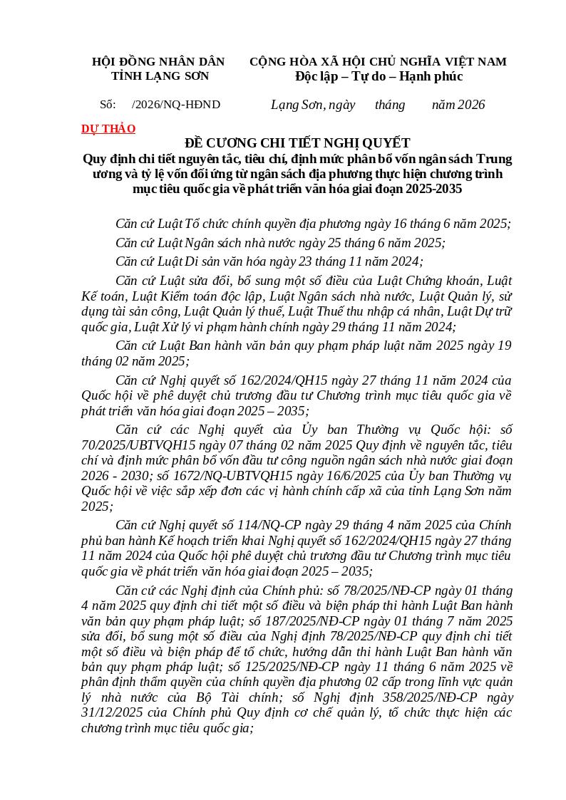 Xét Tờ trình số /TTr-UBND ngày tháng năm 2026 của Ủy ban nhân dân tỉnh về dự thảo Nghị quyết của Hội đồng nhân dân tỉnh quy định chi tiết nguyên tắc, tiêu chí, định mức phân bổ vốn ngân sách Trung ương và tỷ lệ vốn đối ứng từ ngân sách địa phương thực hiện chương trình mục tiêu quốc gia về phát triển văn hóa giai đoạn 2025-2035; Báo cáo thẩm tra của Ban Văn hóa - Xã hội, Hội đồng nhân dân tỉnh; ý kiến thảo luận của đại biểu Hội đồng nhân dân tỉnh tại kỳ họp.