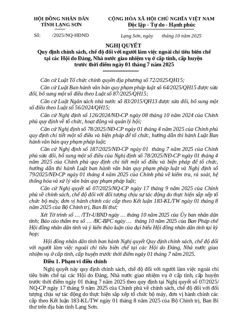 Nghị quyết này quy định chính sách, chế độ đối với người làm việc ngoài chỉ tiêu biên chế tại các Hội do Đảng, Nhà nước giao nhiệm vụ ở cấp tỉnh, cấp huyện trước thời điểm ngày 01 tháng 7 năm 2025 theo quy định tại Nghị quyết số 07/2025/NQ-CP ngày 17 tháng 9 năm 2025 của Chính phủ về chính sách, chế độ đối với đối tượng chịu sự tác động do thực hiện sắp xếp tổ chức bộ máy, đơn vị hành chính các cấp theo Kết luận 183-KL/TW ngày 01 tháng 8 năm 2025 của Bộ Chính trị, Ban Bí thư trên địa bàn tỉnh Lạng Sơn.