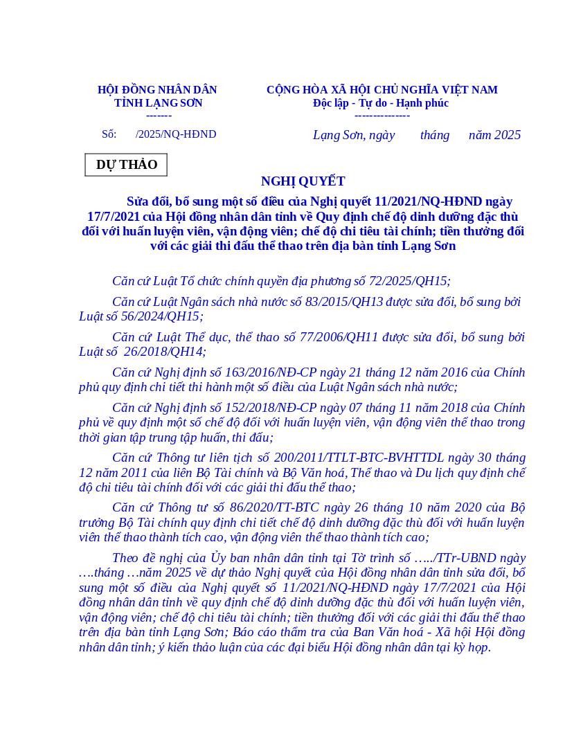 Theo đề nghị của Ủy ban nhân dân tỉnh tại Tờ trình số …../TTr-UBND ngày ….tháng …năm 2025 về dự thảo Nghị quyết của Hội đồng nhân dân tỉnh sửa đổi, bổ sung một số điều của Nghị quyết số 11/2021/NQ-HĐND ngày 17/7/2021 của Hội đồng nhân dân tỉnh về quy định chế độ dinh dưỡng đặc thù đối với huấn luyện viên, vận động viên; chế độ chi tiêu tài chính; tiền thưởng đối với các giải thi đấu thể thao trên địa bàn tỉnh Lạng Sơn; Báo cáo thẩm tra của Ban Văn hoá - Xã hội Hội đồng nhân dân tỉnh; ý kiến thảo luận của các đại biểu Hội đồng nhân dân tại kỳ họp.