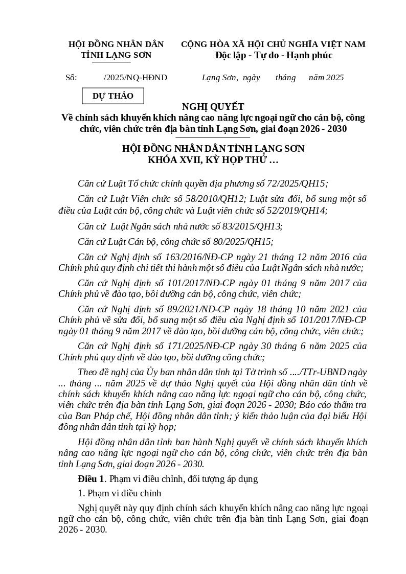 Theo đề nghị của Ủy ban nhân dân tỉnh tại Tờ trình số ..../TTr-UBND ngày ... tháng ... năm 2025 về dự thảo Nghị quyết của Hội đồng nhân dân tỉnh về chính sách khuyến khích nâng cao năng lực ngoại ngữ cho cán bộ, công chức, viên chức trên địa bàn tỉnh Lạng Sơn, giai đoạn 2026 - 2030; Báo cáo thẩm tra của Ban Pháp chế, Hội đồng nhân dân tỉnh; ý kiến thảo luận của đại biểu Hội đồng nhân dân tỉnh tại kỳ họp;