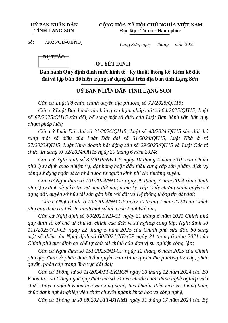 Ban hành Quy định định mức kinh tế - kỹ thuật thống kê, kiểm kê đất đai và lập bản đồ hiện trạng sử dụng đất trên địa bàn tỉnh Lạng Sơn