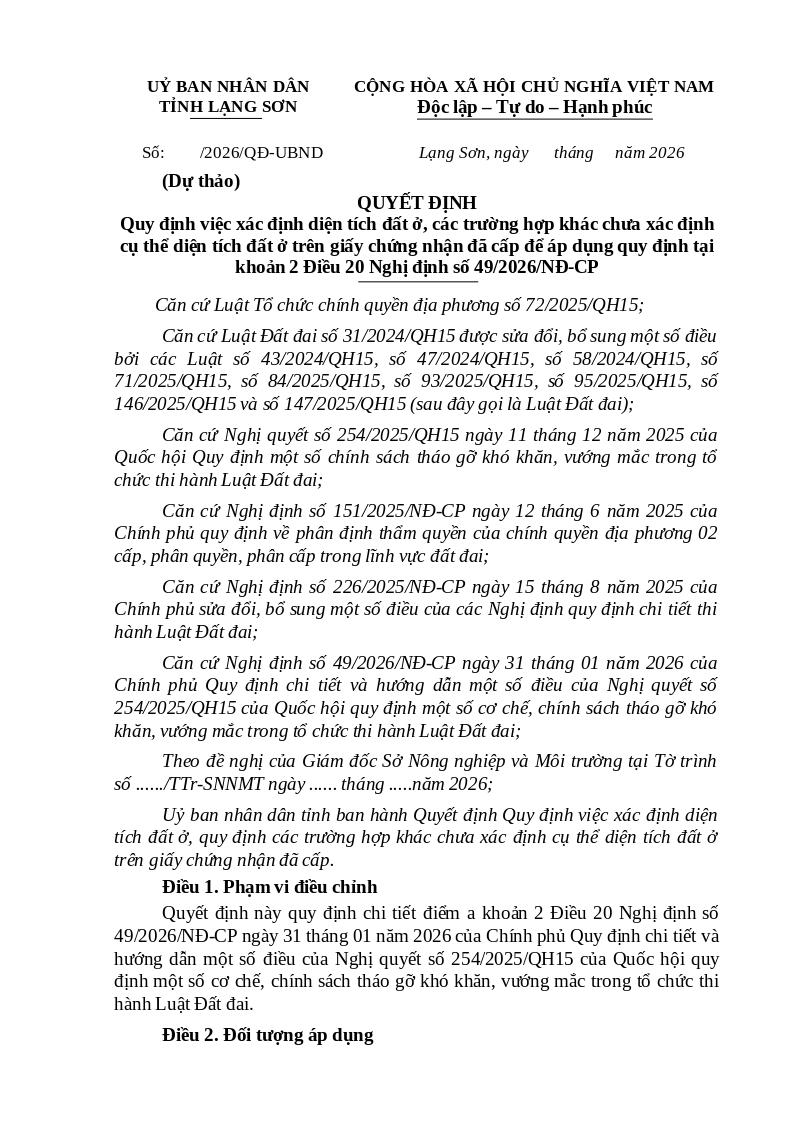 Quy định việc xác định diện tích đất ở, các trường hợp khác chưa xác định cụ thể diện tích đất ở trên giấy chứng nhận đã cấp để áp dụng quy định tại khoản 2 Điều 20 Nghị định số 49/2026/NĐ-CP