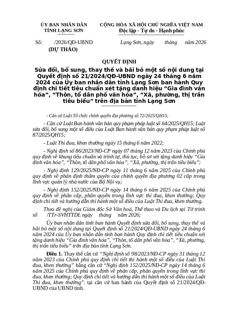Sửa đổi, bổ sung, thay thế và bãi bỏ một số nội dung tại Quyết định số 21/2024/QĐ-UBND ngày 24 tháng 6 năm 2024 của Ủy ban nhân dân tỉnh Lạng Sơn ban hành Quy định chi tiết tiêu chuẩn xét tặng danh hiệu “Gia đình văn hóa”, “Thôn, tổ dân phố văn hóa”, “Xã, phường, thị trấn tiêu biểu” trên địa bàn tỉnh Lạng Sơn