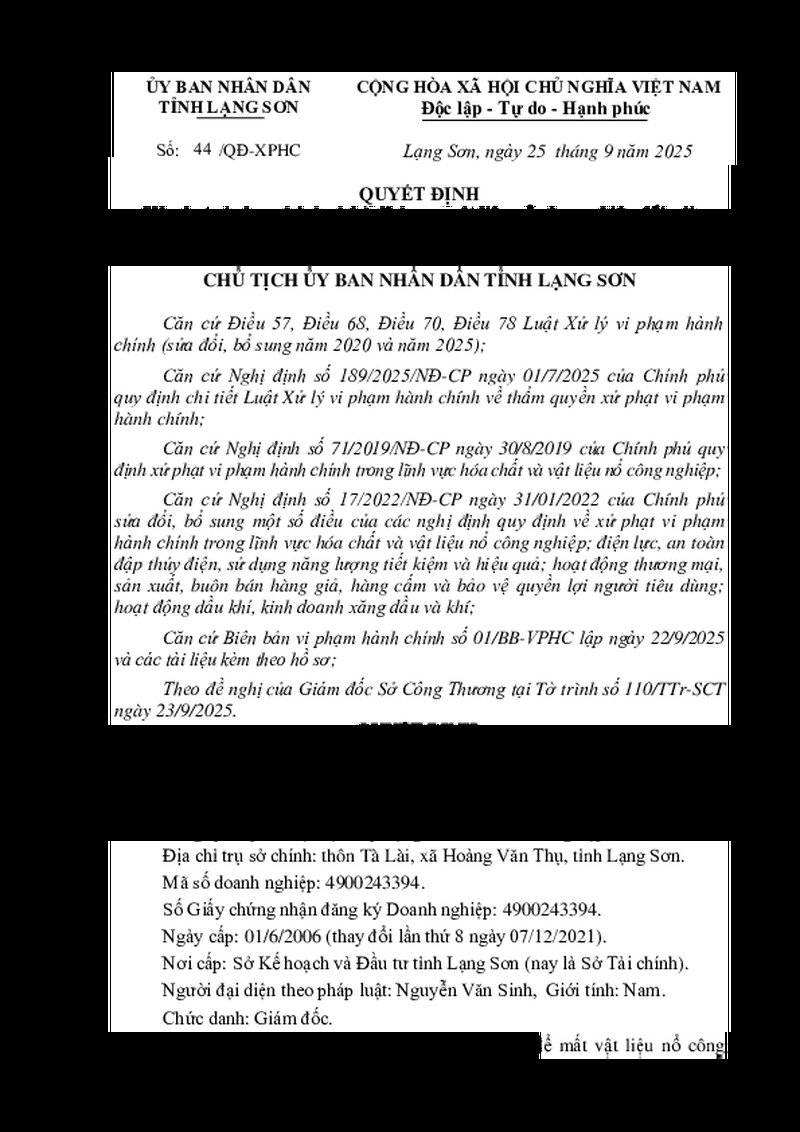 | Tiêu đề văn bản | Xử phạt vi phạm hành chính lĩnh vực vật liệu nổ công nghiệp đối với Công ty cổ phần vật liệu xây dựng và kinh doanh tổng hợp - VVMI | ||