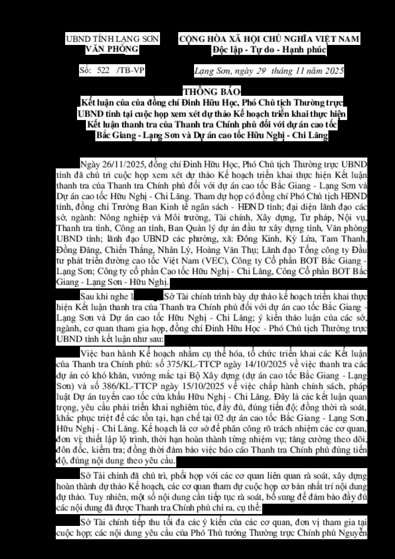 | Tiêu đề văn bản | Kết luận của của đồng chí Đinh Hữu Học, Phó Chủ tịch Thường trực UBND tỉnh tại cuộc họp xem xét dự thảo Kế hoạch triển khai thực hiện Kết luận thanh tra của Thanh tra Chính phủ đối với dự án cao tốc Bắc Giang - Lạng Sơn và Dự án cao tốc Hữu Nghị - Chi Lăng | ||