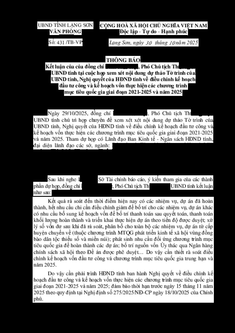 | Tiêu đề văn bản | Kết luận của của đồng chí Đinh Hữu Học, Phó Chủ tịch Thường trực UBND tỉnh tại cuộc họp xem xét nội dung dự thảo Tờ trình của UBND tỉnh, Nghị quyết của HĐND tỉnh về điều chỉnh kế hoạch đầu tư công và kế hoạch vốn thực hiện các chương trình mục tiêu quốc gia giai đoạn 2021-2025 và năm 2025 | ||