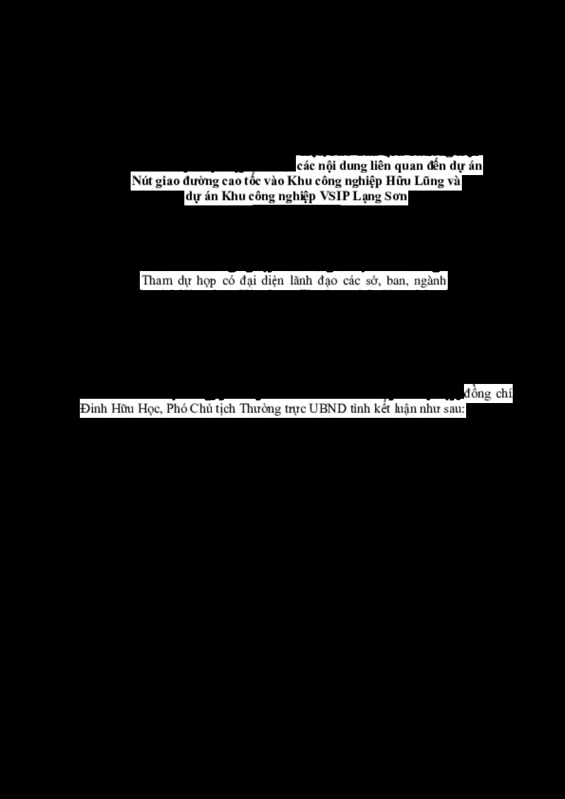 | Tiêu đề văn bản | Kết luận của đồng chí Đinh Hữu Học, Phó Chủ tịch Thường trực UBND tỉnh tại cuộc họp xem xét các nội dung liên quan đến dự án Nút giao đường cao tốc vào Khu công nghiệp Hữu Lũng và dự án Khu công nghiệp VSIP Lạng Sơn | ||
