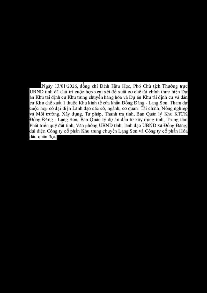 | Tiêu đề văn bản | Kết luận của đồng chí Đinh Hữu Học, Phó Chủ tịch Thường trực UBND tỉnh tại cuộc họp xem xét đề xuất cơ chế tài chính thực hiện Dự án Khu tái định cư Khu trung chuyển hàng hóa và Dự án Khu tái định cư và dân cư Khu chế xuất 1 thuộc Khu kinh tế cửa khẩu Đồng Đăng - Lạng Sơn | ||