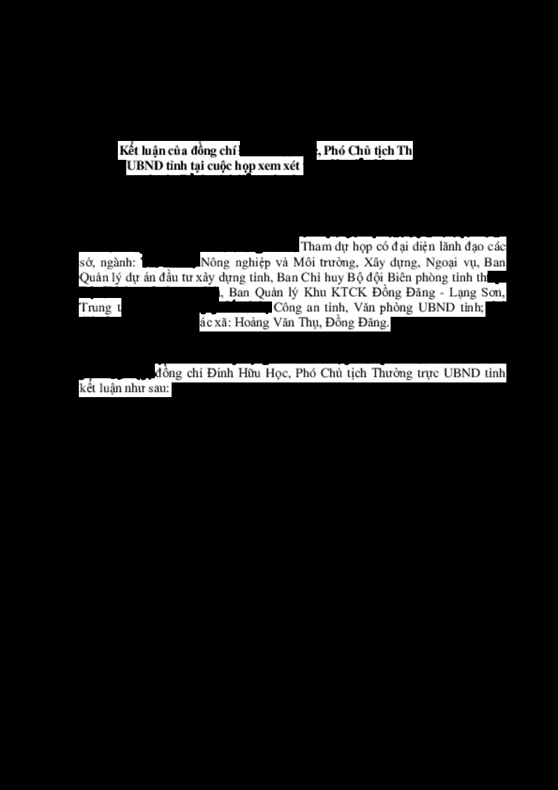 | Tiêu đề văn bản | Kết luận của đồng chí Đinh Hữu Học, Phó Chủ tịch Thường trực UBND tỉnh tại cuộc họp xem xét tiến độ triển khai các dự án thuộc Đề án thí điểm xây dựng cửa khẩu thông minh | ||