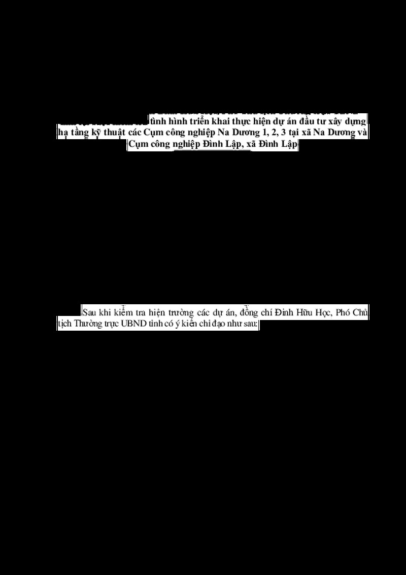 | Tiêu đề văn bản | Kết luận của đồng chí Đinh Hữu Học, Phó Chủ tịch Thường trực UBND tỉnh tại cuộc kiểm tra tình hình triển khai thực hiện dự án đầu tư xây dựng hạ tầng kỹ thuật các Cụm công nghiệp Na Dương 1, 2, 3 tại xã Na Dương và Cụm công nghiệp Đình Lập, xã Đình Lập | ||