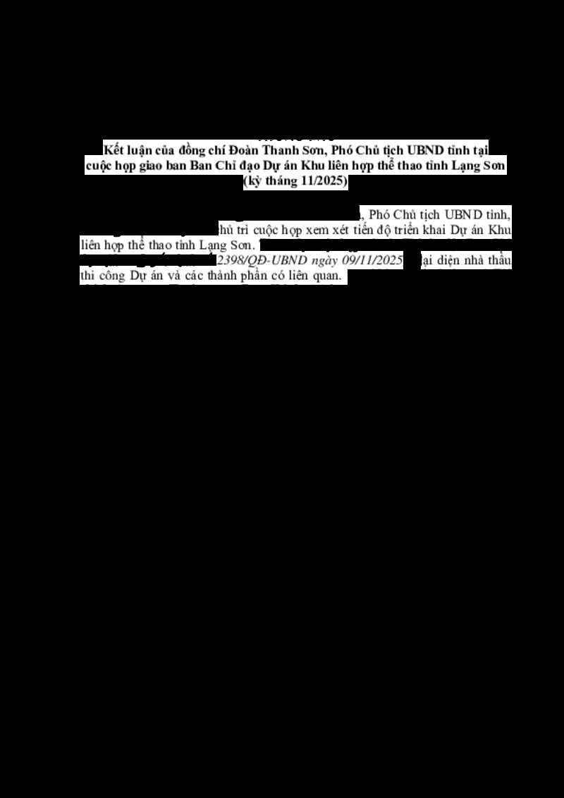 | Tiêu đề văn bản | Kết luận của đồng chí Đoàn Thanh Sơn, Phó Chủ tịch UBND tỉnh tại cuộc họp Ban Chỉ đạo Dự án Khu liên hợp thể thao tỉnh Lạng Sơn | ||