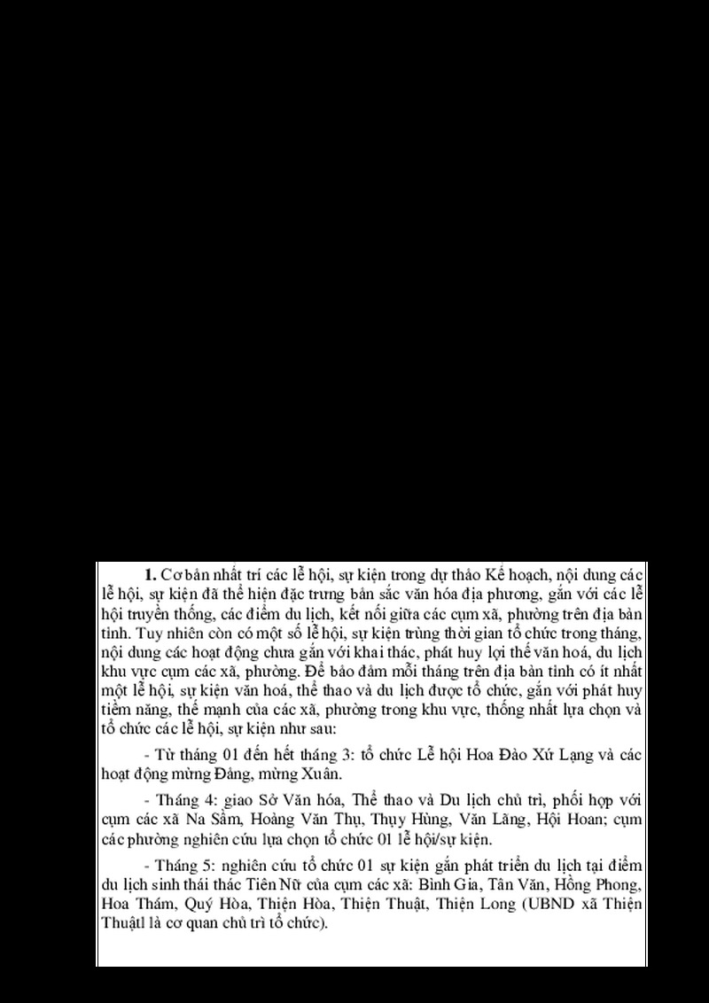 | Tiêu đề văn bản | Kết luận của đồng chí Đoàn Thanh Sơn, Phó Chủ tịch UBND tỉnh tại cuộc họp chuyên đề xem xét dự thảo Kế hoạch tổng thể về tổ chức các Lễ hội, sự kiện văn hóa, thể thao, du lịch theo các cụm liên xã, phường trên địa bàn tỉnh Lạng Sơn | ||