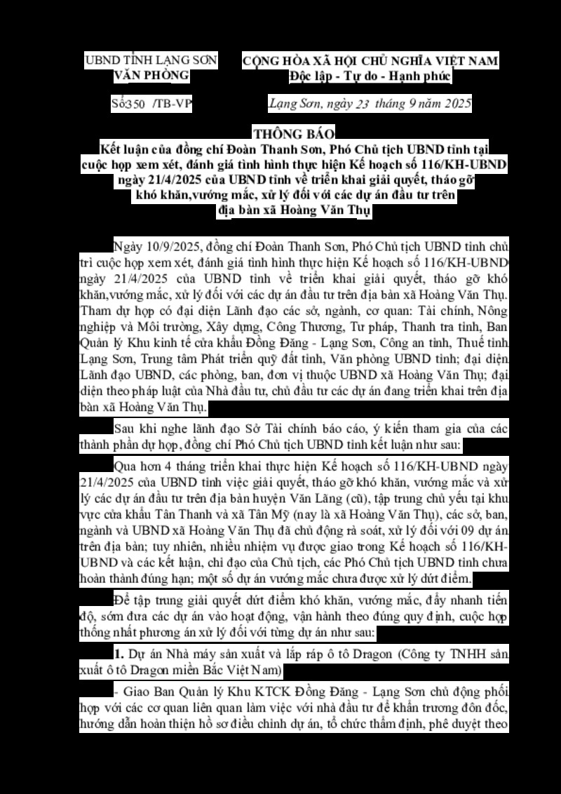| Tiêu đề văn bản | Kết luận của đồng chí Đoàn Thanh Sơn, Phó Chủ tịch UBND tỉnh tại cuộc họp xem xét, đánh giá tình hình thực hiện Kế hoạch số 116/KH-UBND ngày 21/4/2025 của UBND tỉnh về triển khai giải quyết, tháo gỡ khó khăn,vướng mắc, xử lý đối với các dự án đầu tư trên địa bàn xã Hoàng Văn Thụ | ||