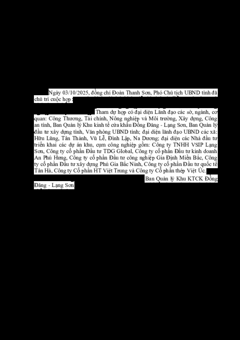 | Tiêu đề văn bản | Kết luận của đồng chí Đoàn Thanh Sơn, Phó Chủ tịch UBND tỉnh tại cuộc họp xem xét tiến độ triển khai các dự án khu, cụm công nghiệp đã thành lập trên địa bàn tỉnh | ||