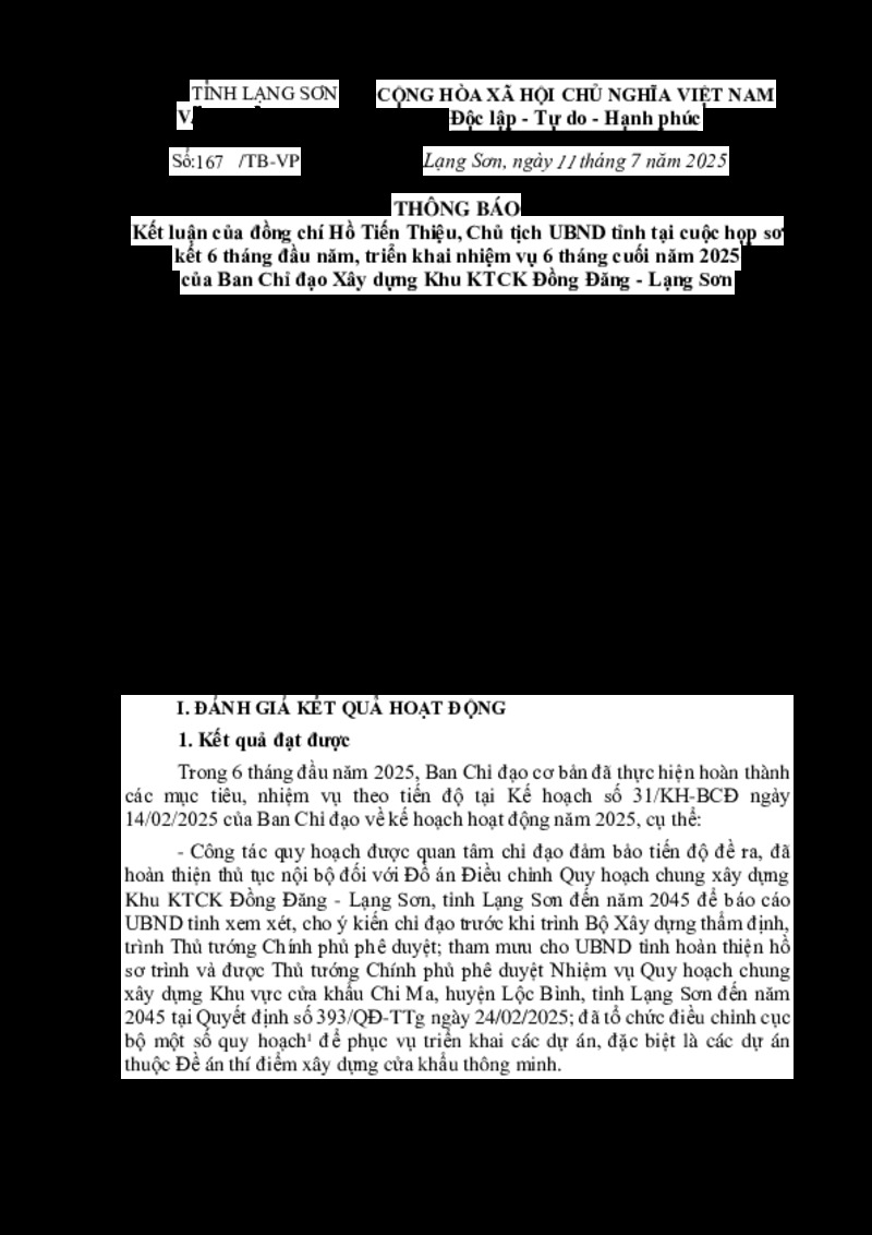 | Tiêu đề văn bản | Kết luận của đồng chí Hồ Tiến Thiệu, Chủ tịch UBND tỉnh tại cuộc họp sơ kết 6 tháng đầu năm, triển khai nhiệm vụ 6 tháng cuối năm 2025 Ban Chỉ đạo Xây dựng Khu KTCK Đồng Đăng - Lạng Sơn | ||