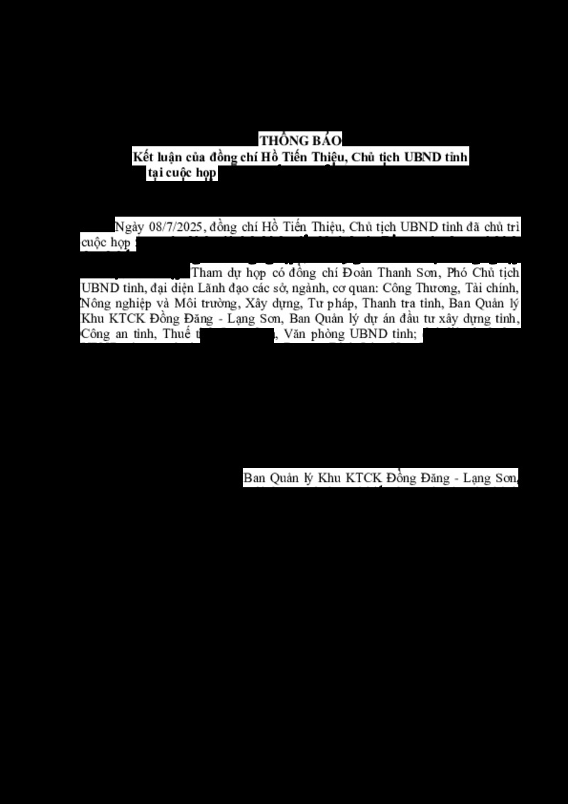 | Tiêu đề văn bản | Kết luận của đồng chí Hồ Tiến Thiệu, Chủ tịch UBND tỉnh tại cuộc họp xem xét tiến độ triển khai các dự án khu, cụm công nghiệp đã thành lập trên địa bàn tỉnh | ||