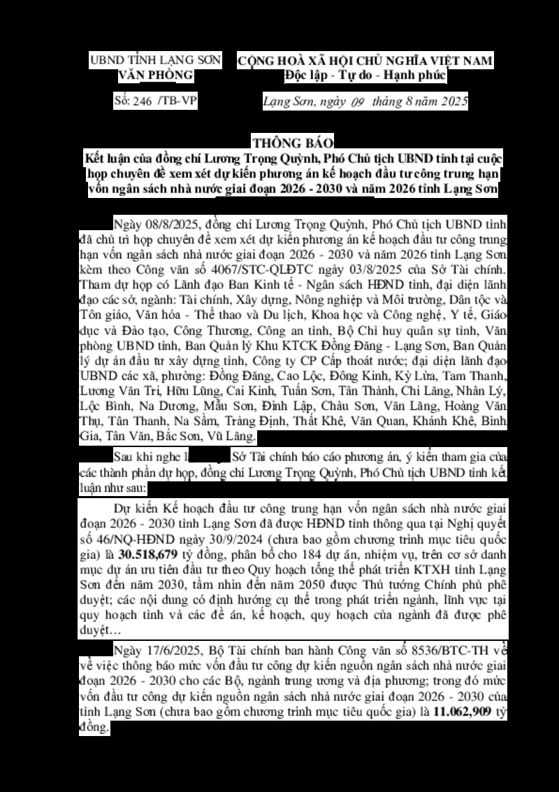 | Tiêu đề văn bản | Kết luận của đồng chí Lương Trọng Quỳnh, Phó Chủ tịch UBND tỉnh tại cuộc họp chuyên đề xem xét dự kiến phương án kế hoạch đầu tư công trung hạn vốn ngân sách nhà nước giai đoạn 2026 - 2030 và năm 2026 tỉnh Lạng Sơn | ||