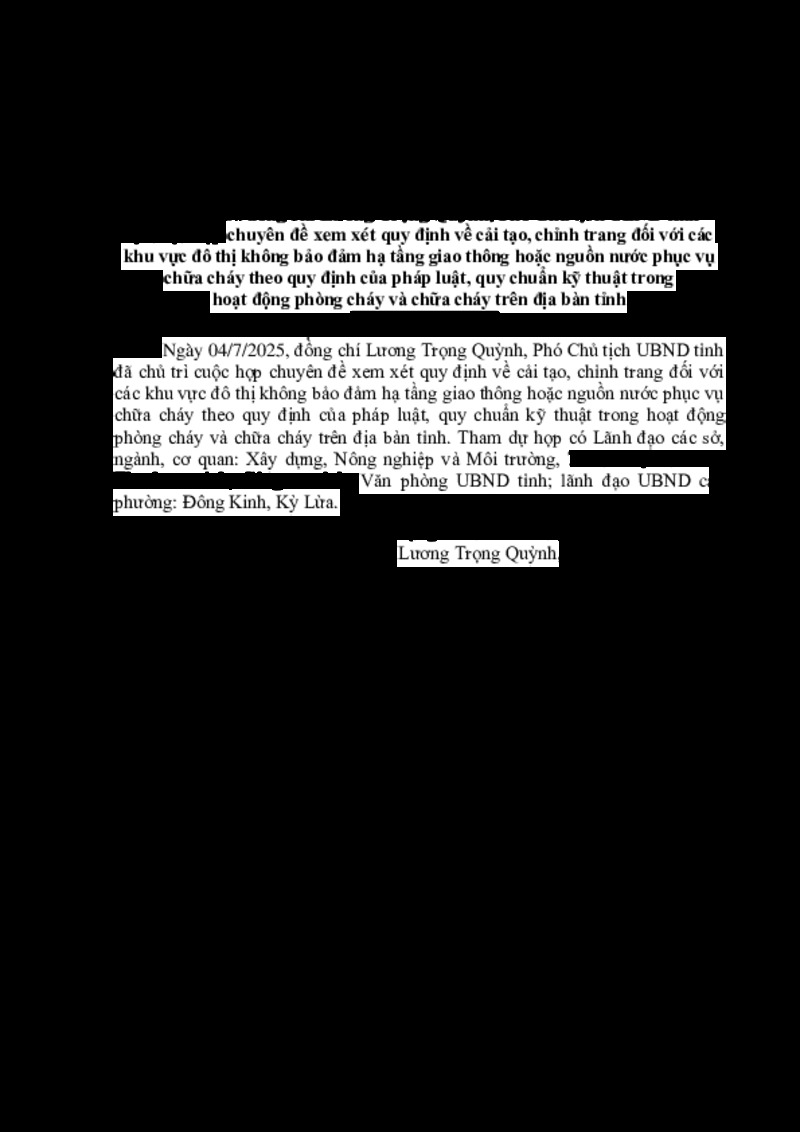 | Tiêu đề văn bản | Kết luận của đồng chí Lương Trọng Quỳnh, Phó Chủ tịch UBND tỉnh tại cuộc họp chuyên đề xem xét quy định về cải tạo, chỉnh trang đối với các khu vực đô thị không bảo đảm hạ tầng giao thông hoặc nguồn nước phục vụ chữa cháy theo quy định của pháp luật, quy chuẩn kỹ thuật trong hoạt động phòng cháy và chữa cháy trên địa bàn tỉnh | ||