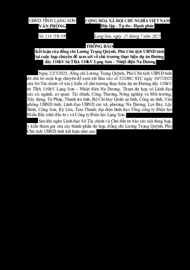 | Tiêu đề văn bản | Kết luận của đồng chí Lương Trọng Quỳnh, Phó Chủ tịch UBND tỉnh tại cuộc họp chuyên đề xem xét về chủ trương thực hiện dự án Đường dây 110kV từ TBA 110kV Lạng Sơn - Nhiệt điện Na Dương | ||