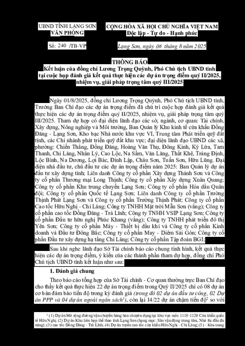 | Tiêu đề văn bản | Kết luận của đồng chí Lương Trọng Quỳnh, Phó Chủ tịch UBND tỉnh tại cuộc họp đánh giá kết quả thực hiện các dự án trọng điểm quý II/2025, nhiệm vụ, giải pháp trọng tâm quý III/2025 | ||