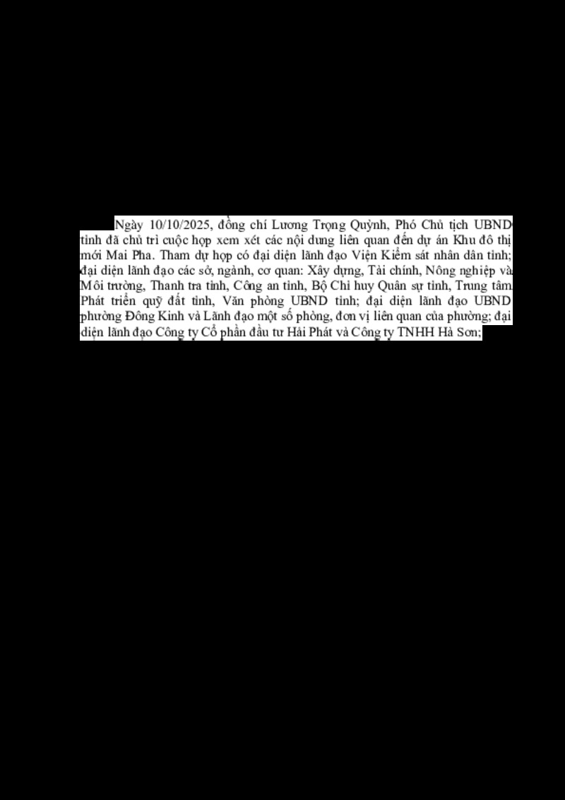 | Tiêu đề văn bản | Kết luận của đồng chí Lương Trọng Quỳnh, Phó Chủ tịch UBND tỉnh tại cuộc họp xem xét các nội dung liên quan đến dự án Khu đô thị mới Mai Pha (phương án điều chỉnh cục bộ quy hoạch chi tiết) | ||